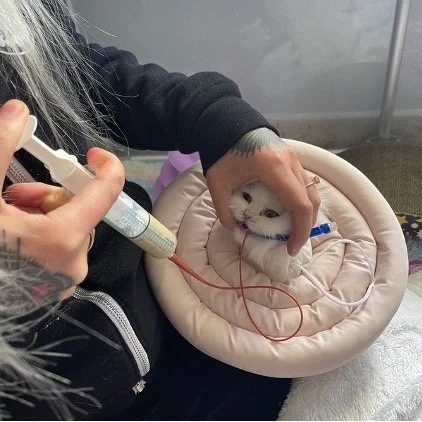 Throughout the duration of tube feeding, you’ll need to regularly calculate the kitten’s stomach capacity and energy needs. This is a delicate balance between the density of the food (so it can fit through the tube), the capacity of the stomach (so you don’t cause regurgitation), and the energy needs of the kitten (so they develop and grow properly.)