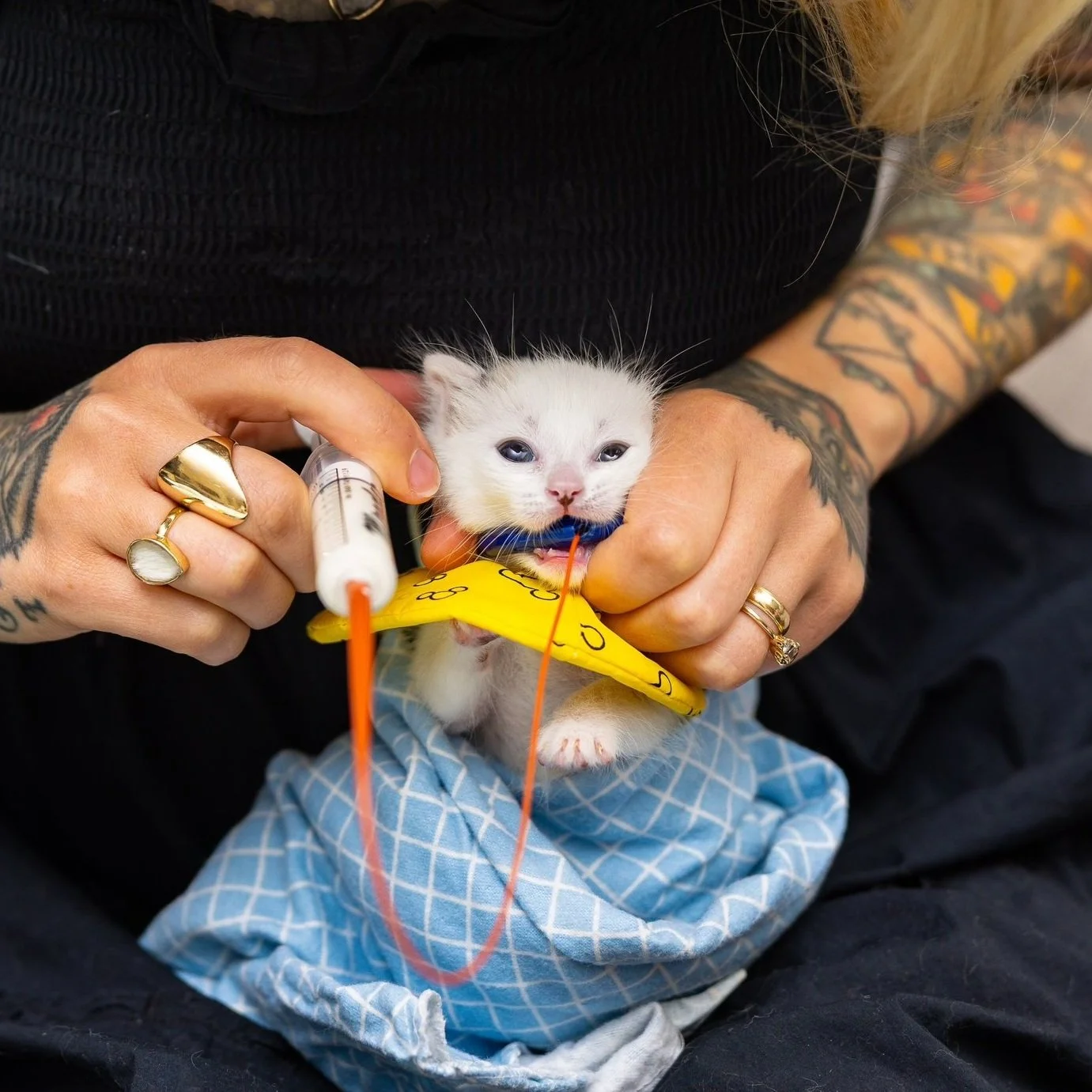 Bite Guard Feeding Help: Tube feeding with a bite guard feels very awkward at first, for both you and the kitten. If struggling, try using an upside-down e-collar or a soft blanket to reduce the activity of the kitten’s limbs and help things go smoothly. Over time, the kitten truly will learn to use the bite guard—but it takes practice!